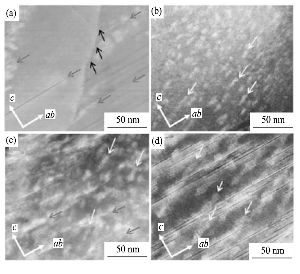 但也有一些例外, 例如文献[20]中, 在以MOCVD法制备的纳米复合薄膜中Selvamanickam等研究者发现当掺入20%Zr时, 能够达到特别好的钉扎效果, 临界电流密度的值在磁场平行于c轴, 30 K, 3 T的情况下可以达到15 mA·cm-2, 而关于在如此高浓度的掺杂条件下, 临界电流密度依然很高的原因, 这可能是在整个薄膜中一维的纳米柱具有非常好的排列, 且在这些纳米柱周围还发现了大量的Cu-Zr纳米颗粒以及堆垛层错的存在, 而这些缺陷的存在可能是导致重掺杂下磁通钉扎效率仍然很高的原因。如图10, 11所示。