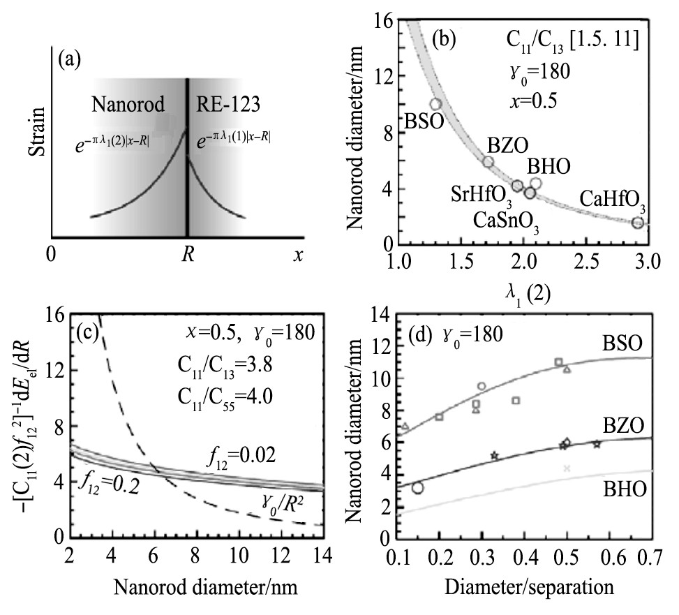 图8 应力场在APC和RE-1 2 3母体中的衰减曲线 (a) ;不同弹性常数C13/C11的APC直径和衰减深度λ1 (2) 的关系图 (b) ;一维APCs的直径与晶格失配f1z之间的依赖关系图 (c) ;一维APCs的直径与其直径和衰减深度的比值之间的依赖曲线 (d) Fig.8 Curves of strain field decay inside both APC and RE-1 2 3 matrix (a) ;1D APC diameter as function of the decay lengthλ1 (2) at several different elastic constants C13/C11of APC (b) ;Dependence of diameter of the 1D-APCs with mismatch of APCs and RE-1 2 3 (c) ;Diameter of 1D APCs as a function of ratio of 1D APCs diameter to decay length for BSO, BZO, and BHO 1DAPCs (d) [9]