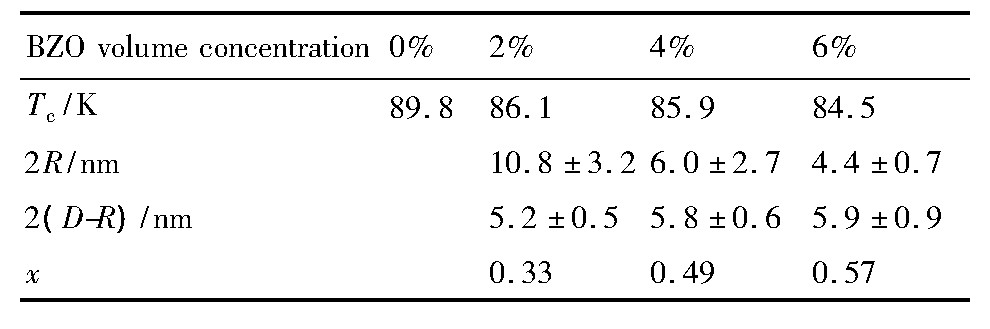 表1 不同掺杂浓度下, 复合薄膜的临界温度Tc、纳米棒的直径2 R、纳米棒之间的距离2 (D-R) 以及表征纳米棒密度的对应值[19]Table 1 Diameter (2R) and wall-to-wall spacing (2 (D-R) ) of vertically aligned BZO nanorods and Tcof c-oriented BZO doped YBCO films with different volume concentrations of BZO, where x=R/D