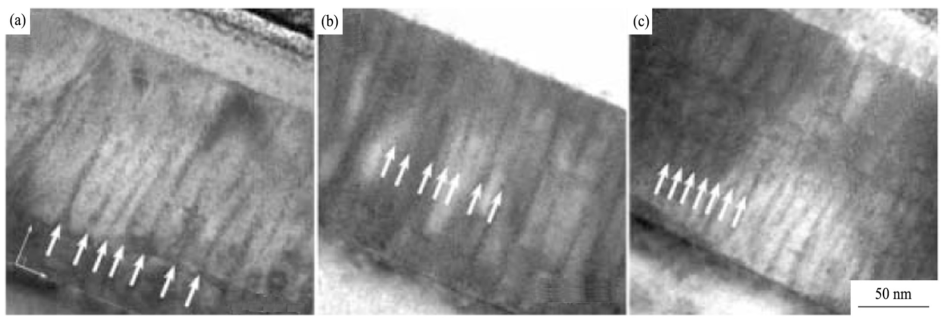 图3 复合薄膜横截面的扫描透射电镜的明场像图像对应的电子选区衍射图像为APCs的光学放大晶粒边界处的图像晶粒内部的图像Fig.3A cross-sectional STEM-BF image (a) and a corre-sponding selected area electron diffraction pattern (b) , representing images of APCs at higher magnifica-tion (c) to (e) , at vicinity of grain boundary (c) and (d) and at grain interior (e) [12]
