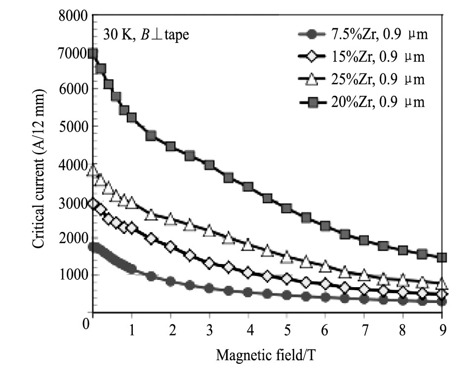 图1 1 不同掺杂水平下, 临界电流密度与外磁场之间的关系Fig.11 Magnetic field dependence of critical currents of a 2.2μm Gd YBCO tape with 20%Zr addition and best 0.9μm thick (Gd, Y) BCO tapes with 7.5%, 15%and25%Zr addition at 30 K in orientation of filed along c-axis[20]