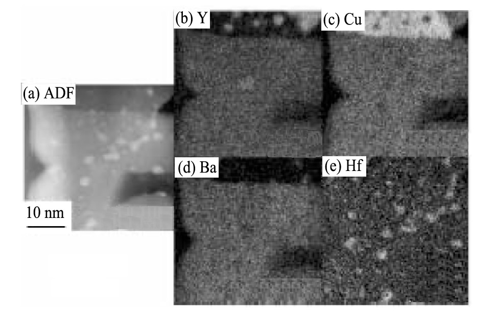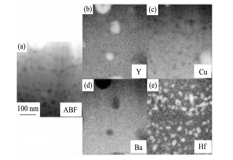 图1 3 增加保温热处理的YBCO薄膜的扫描透射电镜图像Fig.13 STEM image of the YBCO film with holding tempera-ture (a) and EDS maps of Y (b) , Cu (c) , Ba (d) , Hf (e) [30]