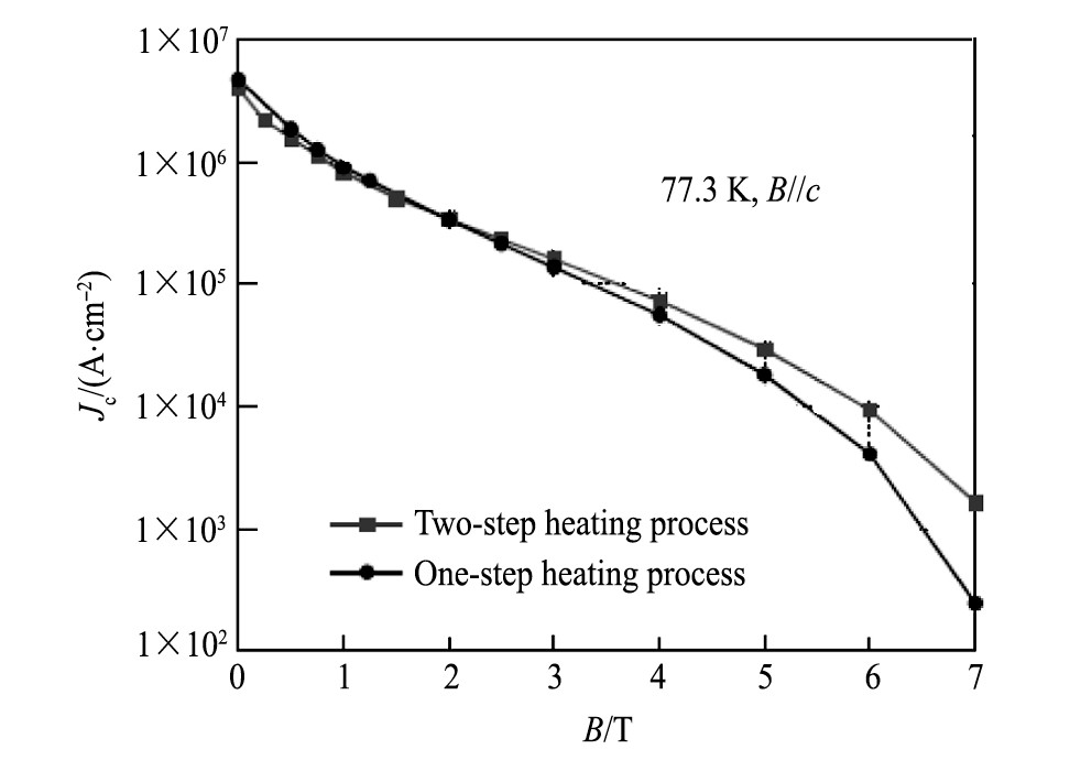 图1 6 77.3 K下用两步热处理法与一步热处理法制备的薄膜自场临界电流密度与磁场的依赖关系图[31]Fig.16In-field Jcproperties at 77.3 K of films fabricated using two-step and one-step heating processes.Mag-netic fields were applied parallel to c-axis of YB-CO[31]