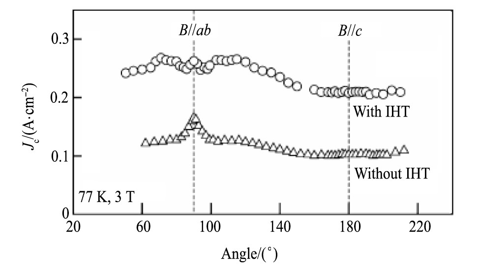 图1 9 有无IHT过程对BZO掺杂的YGd BCO薄膜的临界电流密度特性的影响结果Fig.19 Jc (θ, H) properties of BZO-doped YGd BCO films fab-ricated with and without IHT[34]