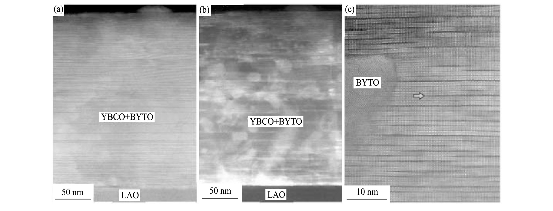 图9 BZO的掺杂浓度分别为2%, 4%, 6%时BZO-YBCO薄膜横截面的TEM图像Fig.9 TEM cross sections of BZO doped YBCO films with different BZO volume concentrations[19]