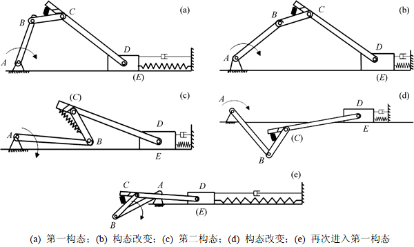 为了方便分析,将机构变胞前后的构态分别称为机构的第一构态和第二构态。取图2(a)所示位置为初始位置,此时,机构处于第一构态,机构等效于曲柄滑块机构;当滑块运动到图2(b)所示的位置时,滑块处于约束状态,变胞副C运动;在图2(c)位置时,机构处于第二构态,变胞副C受到的实际力大于弹簧力,机构相当于一个铰链四杆机构;在图2(d)所示位置时,变胞副C保持相对静止,当曲柄继续转动时,滑块开始运动,机构进入第一构态,如图2(e)所示。