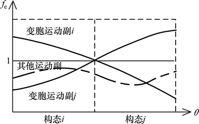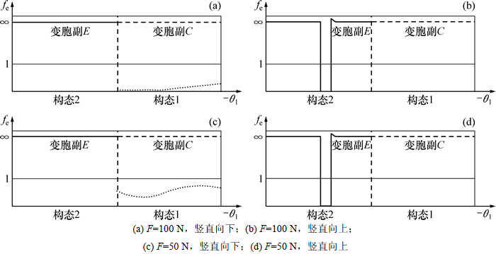 则此时机构中两变胞副同时发生变胞,机构出现随机构态。当R4>|Fk2|时,机构有向右的运动趋势,几何约束提供无穷大的约束力,则fe(θi)=∞,变胞副处于约束状态,构态稳定。