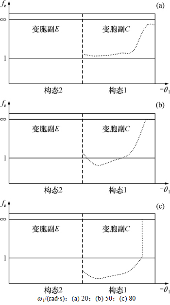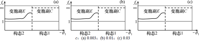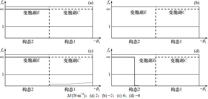 当fe(θi)>1时,变胞副处于约束状态;当fe(θi)<1时,变胞副发生变胞,机构出现随机构态。当ΔT>0时,机构受几何约束的作用,约束力矩为无穷大,此时fe(θi)=∞,转动变胞副C处于约束状态,构态稳定。
