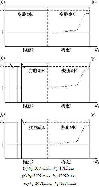 对弹簧的刚度系数k1和k2取不同值时观察等效系数函数曲线如图5所示。对比分析可知,当仅减小弹簧1的刚度系数k1时,机构在第一构态保持过程中一直处于约束状态,在第二构态的变换和保持过程中均出现随机构态;当减小弹簧1的刚度系数k1,增大弹簧2的刚度系数k2时,机构在第一构态保持过程中一直处于约束状态,在第二构态的变换和保持过程中均出现随机构态,对第一构态和第二构态均有较大的影响。