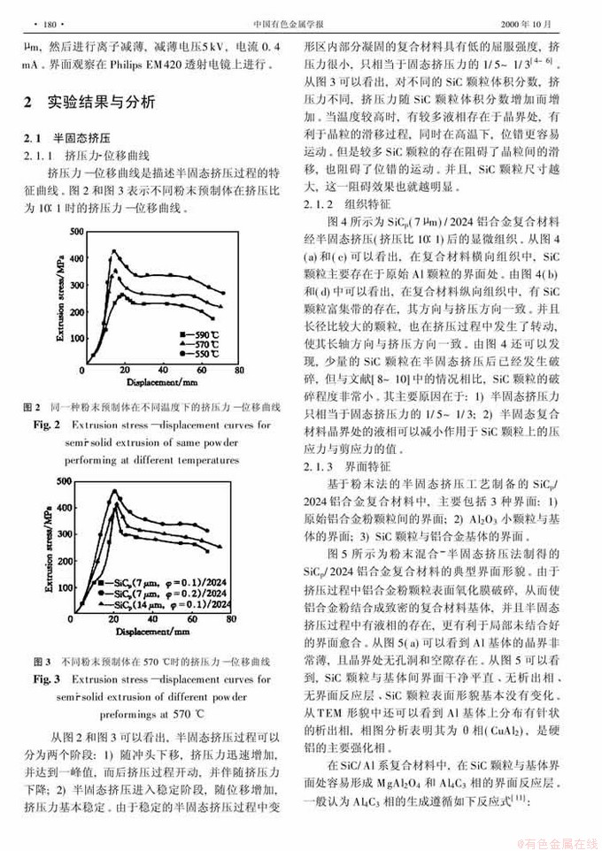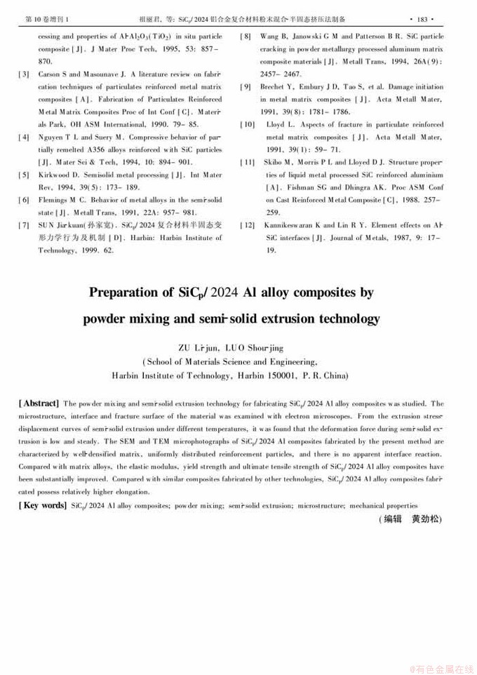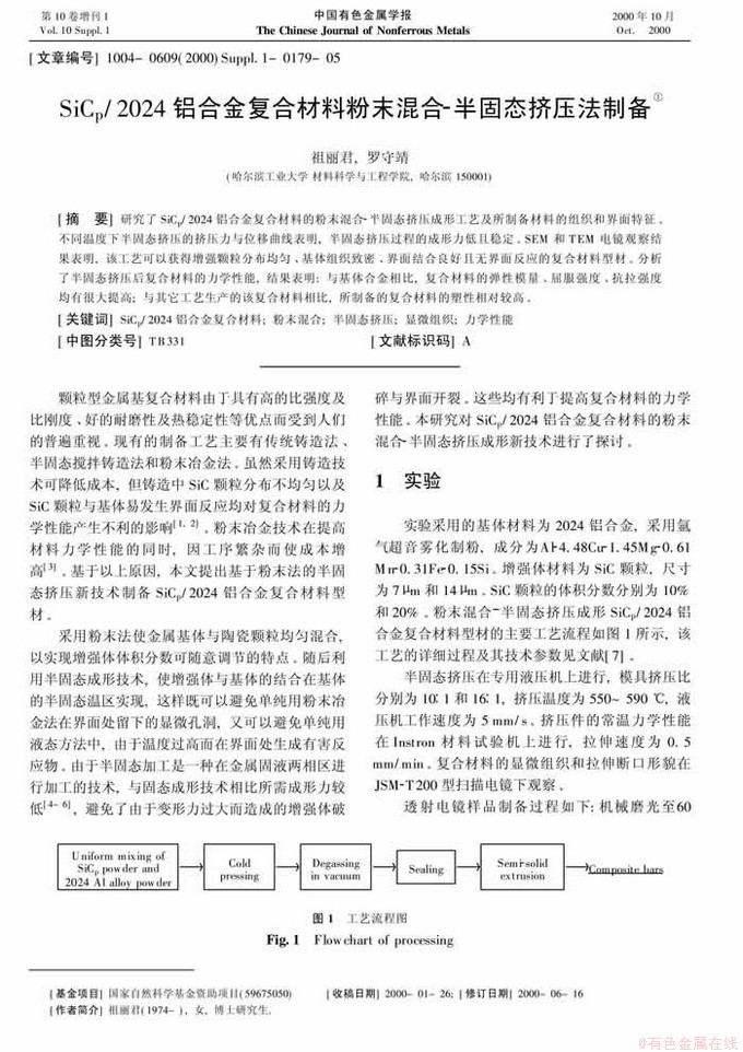 Key words:SiCp/2024 Al alloy composites; powder mixing; semi solid extrusion; microstructure; mechanical properties