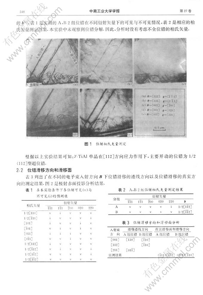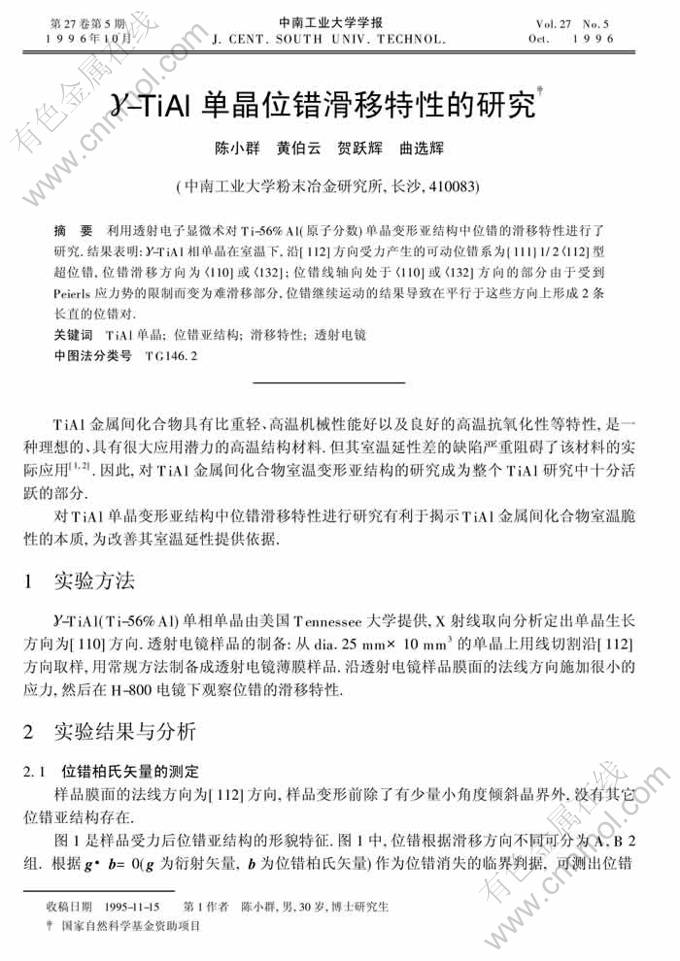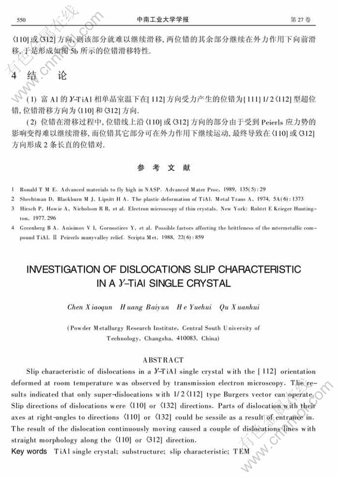 Key words:TiAl single crystal; substructure; slip characteristic; TEM