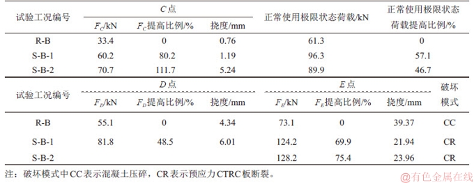 对于S-B-2工况加固梁,当荷载达到FC时,在加固前已存在的裂缝位置对应的预应力CTRC板上产生裂缝,荷载-跨中挠度曲线发生偏转,这是由于预应力CTRC板上出现裂缝后降低了加固梁的刚度。