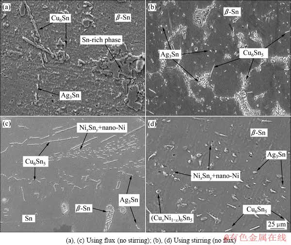 对比图5(a)和(c)可以发现,纳米Ni的添加有利于粗条状Cu6Sn5的细化;从图5(c)和(d)可以看出,搅拌有利于孔洞状的(CuxNi1-x)6Sn5生成和其他化合物的破碎。