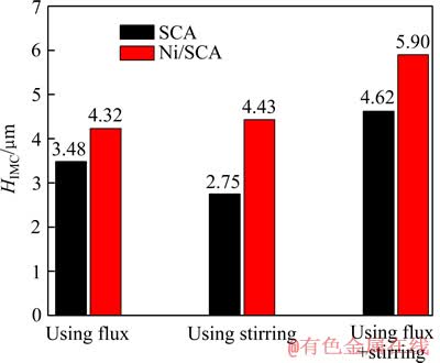 图7所示为6种接头界面IMC平均厚度。对于SCA基体钎焊接头,单纯的机械搅拌无法取代钎剂的作用,钎剂和机械搅拌同时辅助钎焊得到的IMC厚度最大。对比单纯的钎剂辅助和单纯的机械搅拌钎焊发现,单纯的钎剂辅助更有利于SCA钎焊接头中IMC的形成,单纯的机械搅拌更有利于Ni/SCA复合钎料中IMC的形成。而对于Ni/SCA复合钎料,无论是单纯的钎剂辅助还是单纯的机械搅拌,IMC厚度较相同工艺下的SCA钎料都有大幅度的提高,分别提高了24%和61%,说明纳米颗粒Ni的添加对钎焊接头的形成是有利的。在钎剂和机械搅拌的共同作用下,SCA钎焊接头界面IMC厚度较单纯的辅助焊剂接头界面IMC厚度提高了32.7%,较单纯的机械搅拌接头界面IMC厚度提高了68.0%;Ni/SCA复合钎料接头界面IMC厚度较单纯的辅助焊剂接头界面的IMC厚度提高了36.6%,较单纯的机械搅拌接头界面的IMC厚度提高了33.2%。