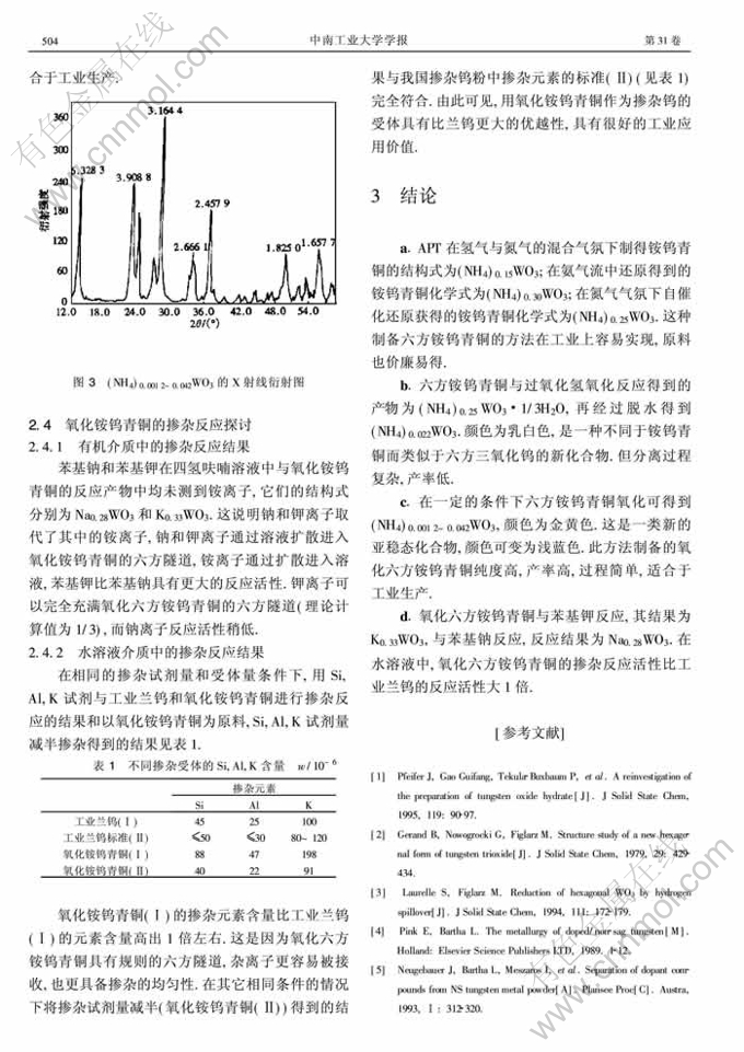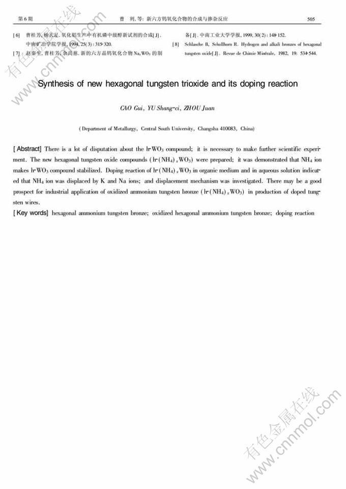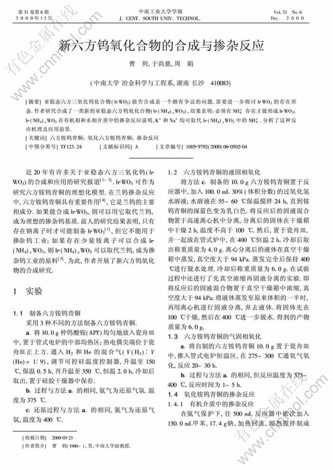Key words:hexagonal ammonium tungsten bronze; oxidized hexagonal ammonium tungsten bronze; doping reaction