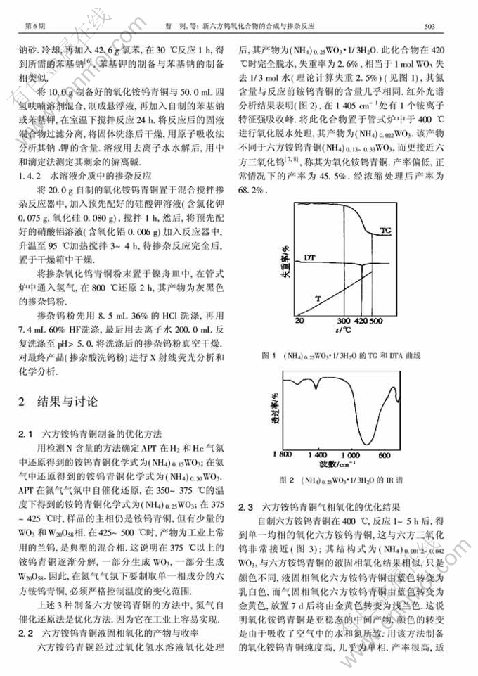 关键词:六方铵钨青铜;氧化六方铵钨青铜;掺杂反应