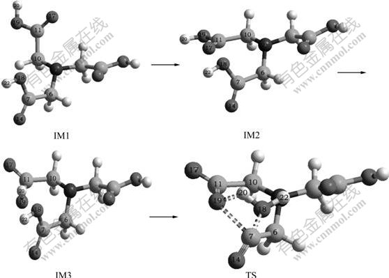 图1中,从IM1到IM2再到IM3,原子间的键长几乎没有变化,但其中二面角的变化比较大;从IM1到IM2,C(6)—N(1)—C(10)—C(11)二面角由162.024 5?变为59.593 3?,从IM2到IM3,N(1)—C(10)—C(11)—C(19)二面角由-167.870 1?变为-7.629 3?。因而,在此过程中氨三乙酸分子中C(6)—N(1)—C(10)—C(11)—C(19)发生旋转,2个羧基有相互靠近的趋势,由于氧原子的强电负性,IM3中,O(18)和H(20)形成分子内氢键。