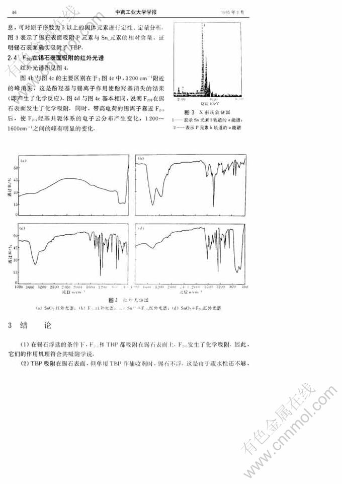 摘 要:利用红外光谱、液相色谱、光电子能谱等研究了F203和TBP混用浮选锡石细泥的作用机理.研究结果表明,F203和TBP共同吸附在锡石表面上.