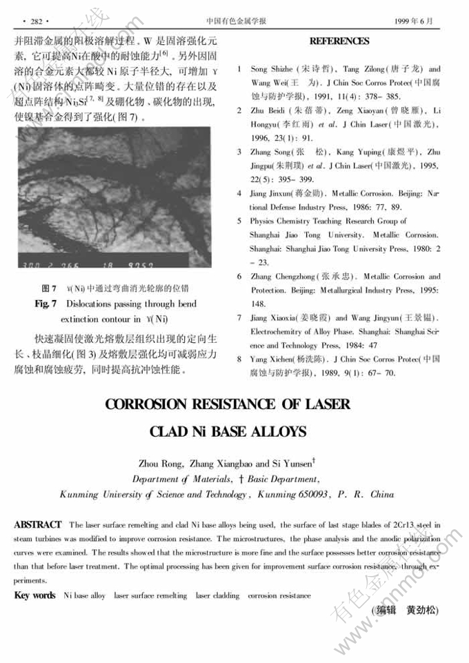 Key words:Ni base alloy; laser surface remelting ; laser cladding ;corrosion resistance