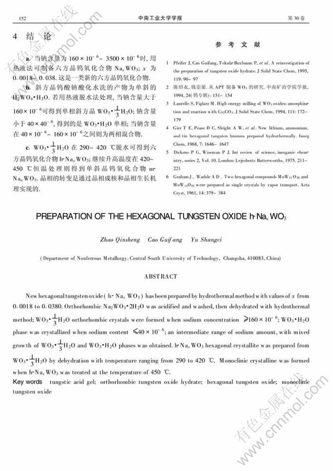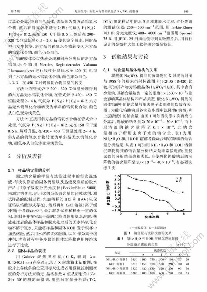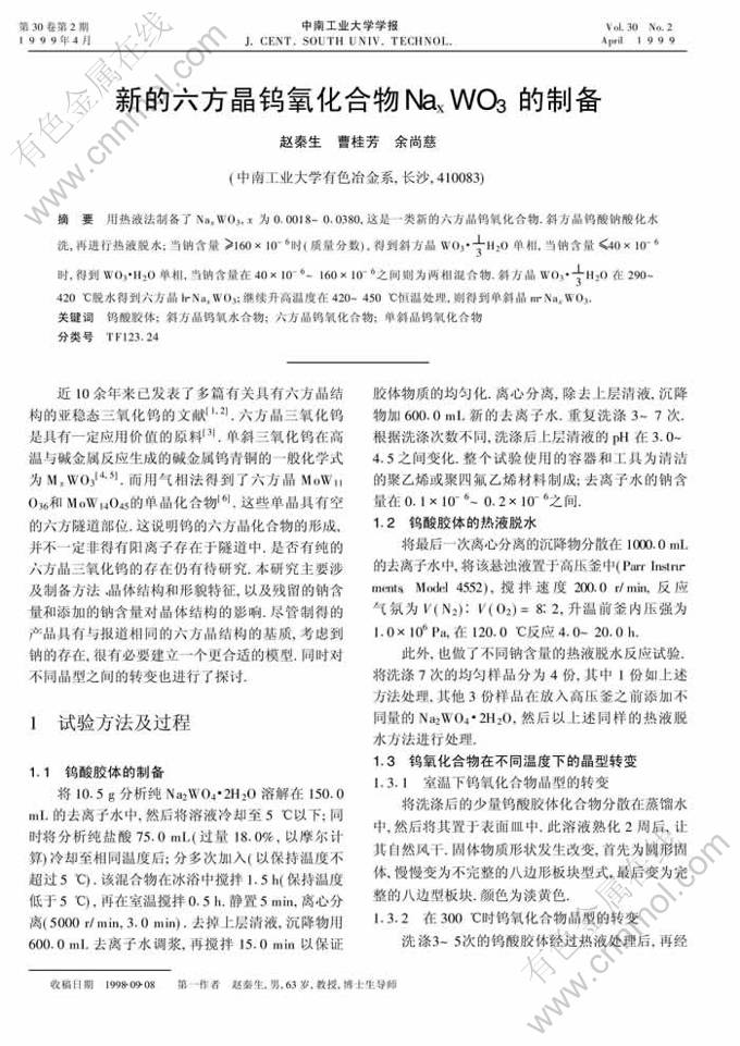 摘 要:用热液法制备了NaxWO3,x为 0.0018~0.0380,这是一类新的六方晶钨氧化合物.斜方晶钨酸钠酸化水洗,再进行热液脱水;当钠含量≥10-6×10-6时(质量分数),得到斜方晶WO3·1/3H2O单相,当钠含量≤40×10-6时,得到WO3·1/3H2O单相,当钠含量在40×10-6~160×10-6之间则为两相混合物.斜方晶WO3·1/3H2O在290~420℃脱水得到六方晶h-NaxWO3;继续升高温度在420~450℃恒温处理,则得到单斜晶m-NaxWO3.