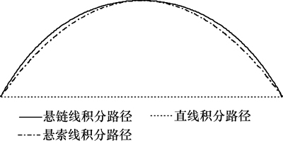 该积分得不到解析解,即使在被积函数形式最简单的情况下(f(x)=1),变为悬链线弧长的式(2)也不能得到解析解。目前常用数值积分求得精确结果并制表[4],或使用ds=dx简化为直线积分求得简化公式[5]。悬链线积分路径、直线积分路径和悬索线积分路径的比较见图1。由图1可以看出:将沿拱轴的悬链线积分路径转换为沿水平的直线积分路径,两者相差很大造成积分结果误差较大。