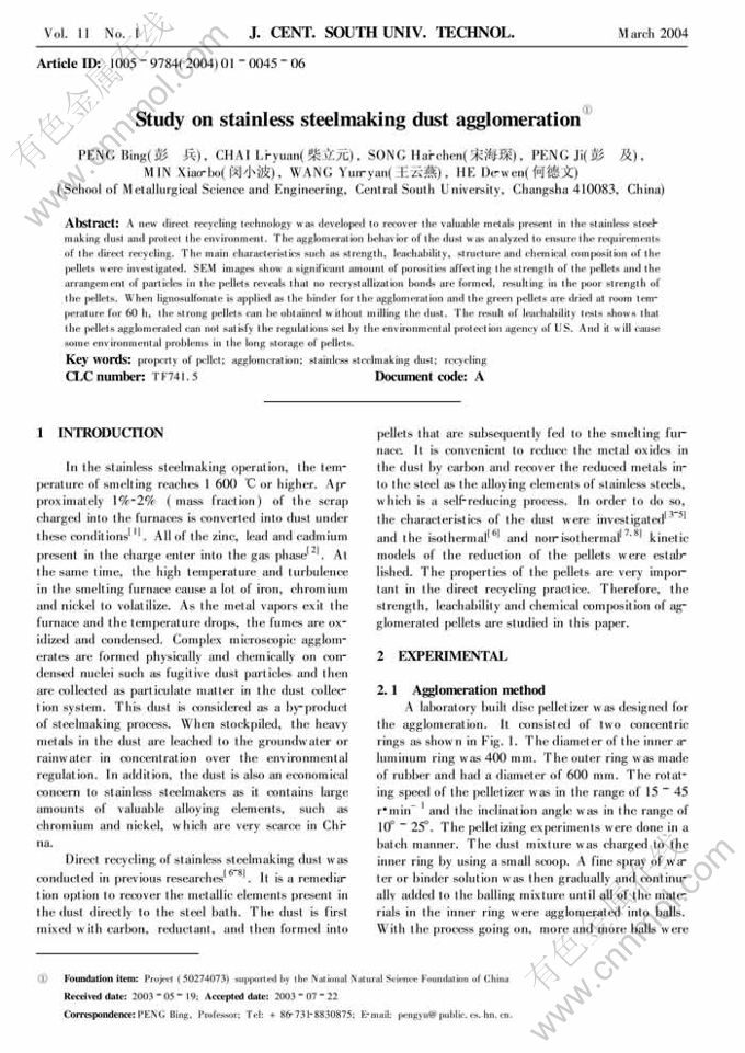 Key words:property of pellet; agglomeration; stainless steelmaking dust; recycling