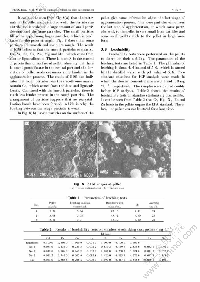 Abstract: A new direct recycling technology was developed to recover the valuable metals present in the stainless steel-making dust and protect the environment. The agglomeration behavior of the dust was analyzed to ensure the requirements of the direct recycling. The main characteristics such as strength, leachability, structure and chemical composition of the pellets were investigated. SEM images show a significant amount of porosities affecting the strength of the pellets and the arrangement of particles in the pellets reveals that no recrystallization bonds are formed, resulting in the poor strength of the pellets. When lignosulfonate is applied as the binder for the agglomeration and the green pellets are dried at room tem-perature for 60 h, the strong pellets can be obtained without milling the dust. The result of leachability tests shows that the pellets agglomerated can not satisfy the regulations set by the environmental protection agency of US. And it will cause some environmental problems in the long storage of pellets.