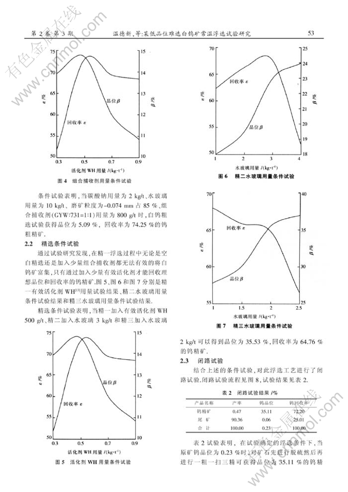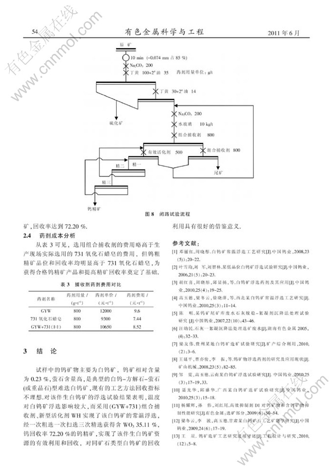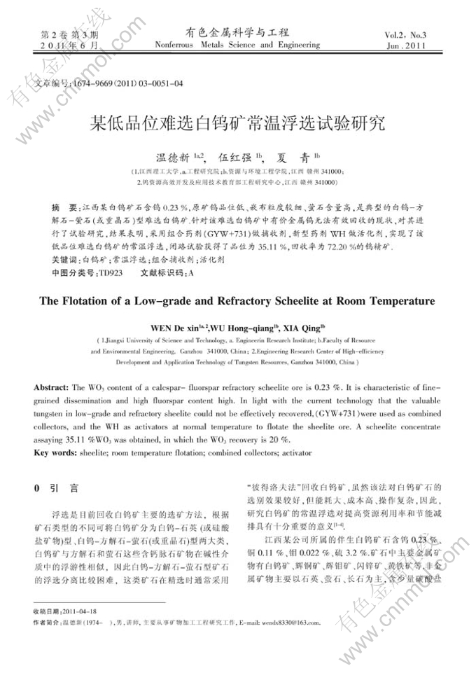 摘 要:江西某白钨矿石含钨0.23%,原矿钨品位低、嵌布粒度较细、萤石含量高,是典型的白钨-方解石-萤石(或重晶石)型难选白钨矿.针对该难选白钨矿中有价金属钨无法有效回收的现状,对其进行了试验研究,结果表明,采用组合药剂(GYW+731)做捕收剂,新型药剂WH做活化剂,实现了该低品位难选白钨矿的常温浮选,闭路试验获得了品位为35.11%,回收率为72.20%的钨精矿.
