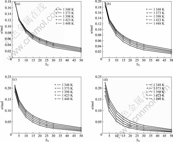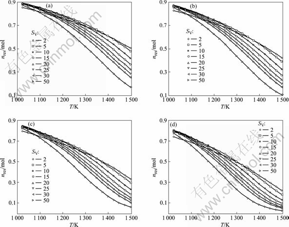 另外,图中曲线出现相交的现象,最为明显的是SV=2的曲线,它同其他曲线都有交点。譬如,p=0.1 MPa时,SV=2的体系与SV=10的体系在1 232 K的nres相同,为0.693 8 mol。这种现象的原因有待进一步的研究。