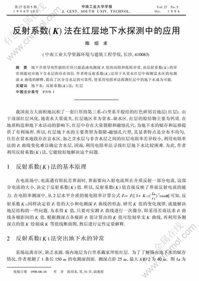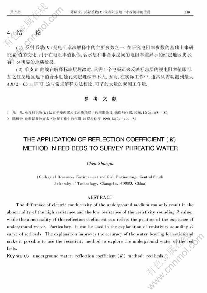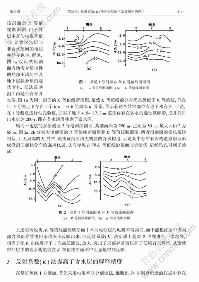 Key words:underground water; reflection coefficient ( K ) method; red beds