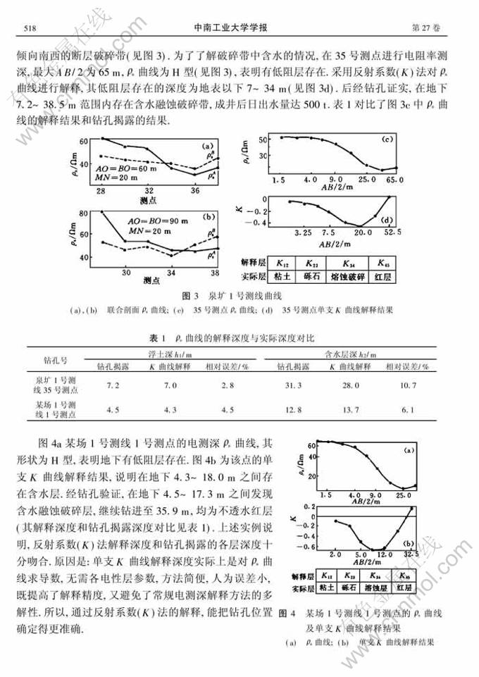 摘 要:地下介质导电性能的差异只能造成电测深ρS值的高阻和低阻异常,而反射系数(K)的异常则能对应地下含水层的存在部位.作者将反射系数(K)法用于从贫水红层中探测富水区的电测深ρS曲线的解释,提高了区分含水层的可靠性,使采用电阻率法探测红层中的地下水成为可能.
