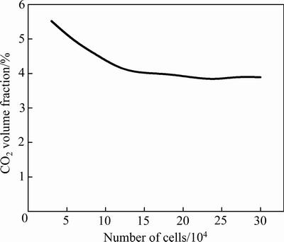 采用四面体结构化网格对计算区域进行离散化,图2所示为不同网格数时计算区域出口CO2体积分数。由图2可知,网格数超过20万个时,计算区域出口处CO2体积分数变化较小,说明此时网格数量对计算精确度的影响可以忽略,因此,结合精确性与计算量的考虑,确定总网格数为20万。