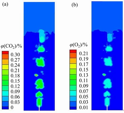 Fig. 3 Volume fraction distribution of CO2(a) and O2(b) in molten slag bath
