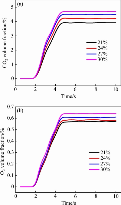 Fig. 7 Variations of CO2(a) and O2(b) volume fractions with time at outlet