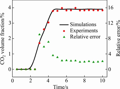 Fig. 12 Experiments, simulations and relative error of CO2 volume fraction