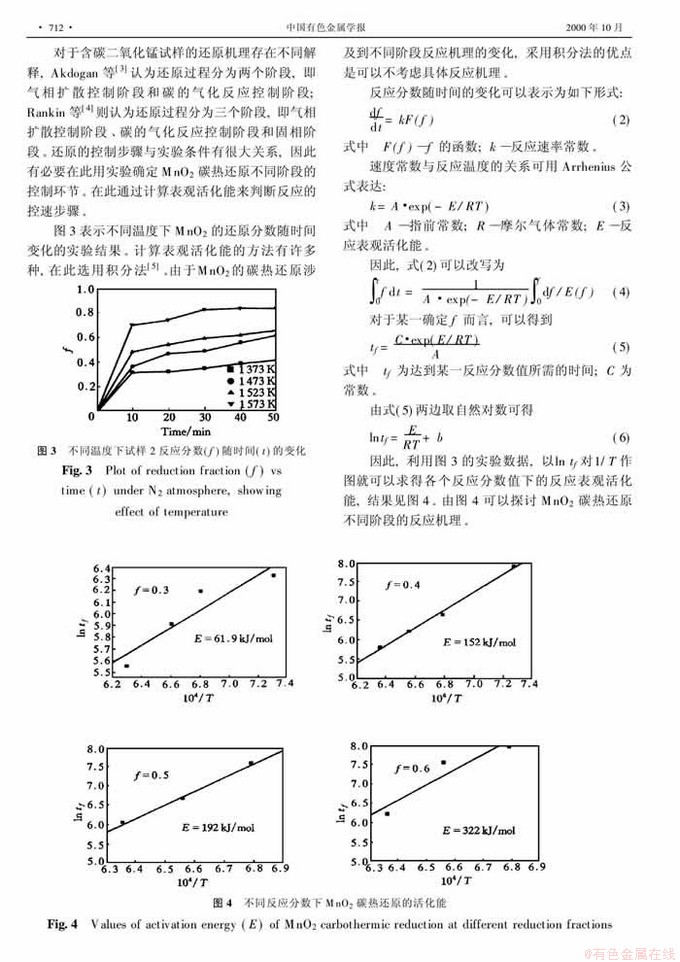 摘 要:在测定MnO2碳热还原表观活化能的基础上, 确认MnO2碳热还原可以分为三个阶段: 1) 在 f <0.3时, 其控制环节为气相扩散, 2) 当0.3< f <0.6时, 其控制环节为碳气化反应, 3) 当 f >0.6时, 其控制环节为固相扩散。 稀土氧化物(La2O3, CeO2和Ce2O3)对MnO2碳热还原有催化作用,并以La2O3效果最佳。 催化的机理在于对碳气化反应的催化。