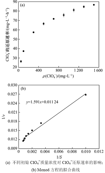 实验中,初始ClO4-质量浓度分别取0,50,100,300,500,700,900,1 100,1 300和1 500 mg/L,得出其对ClO4-厌氧还原速率的影响如图1(a)所示。表明ClO4-的还原速率随着ClO4-质量浓度增大而增大,当ClO4-质量浓度达到1 500 mg/L时,ClO4-的还原速率趋于平稳。