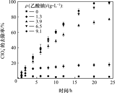 由反应式(4)可知:在初始ClO4-质量浓度和pH分别为1 300 mg/L和6.8的条件下,理论所需醋酸钠的初始质量浓度为1.07 g/L,但是微生物不可能将所有电子完全转移给ClO4-,其他的新陈代谢活动也会消耗电子,且溶液中还可能存在其他竞争离子[19],所以实际反应所需的质量浓度远远大于1.07 g/L。在实验中,初始乙酸钠质量浓度分别取0,1.3,3.9,6.5和9.1 g/L,对ClO4-的厌氧还原去除率的影响如图2所示。