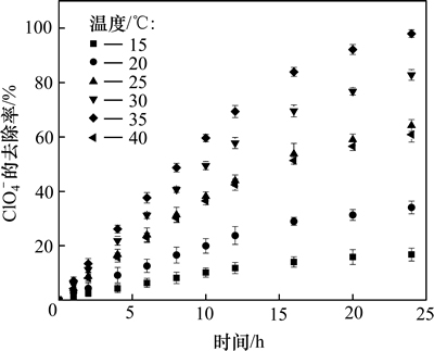 温度主要是通过改变微生物细胞的生长和还原反应中酶的活性,进而影响高氯酸盐的还原。据报道,温度在10~40 ℃范围内,DPRB对ClO4-均有还原作用,且最适温度在28~37 ℃之间[20]。在温度为15,20,25,30,35和40 ℃下进行温度对生物还原性能实验,得出温度对ClO4-去除效果的影响,结果如图4所示。