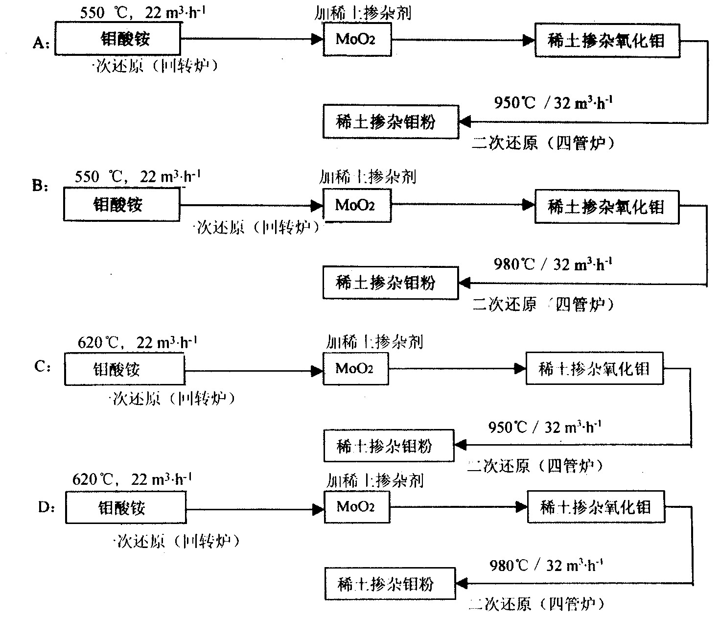 S, Y钼酸铵分别在4种工艺编号下进行还原 (其它工艺参数均相同) , 所出掺杂钼粉编号如下: S-A, S-B, S-C, S-D, Y-A, Y-B, Y-C, Y-D; S, Y钼酸铵分别在A, C工艺编号下不加掺杂剂进行还原 (其它工艺参数均相同) , 所出纯钼粉编号如下: S-a、 Y-c。 上述钼粉生产出来后分别过200目筛网, 筛下物进行费氏平均粒度、 松比、 粒度分布测试。