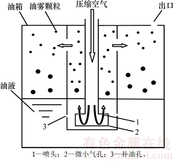 气力式油雾器结构如图1所示。一定压力的压缩空气进入喷头,喷头内部的压力与油液表面上的压力有一定的压差,气体经由直径较小(0.5 mm左右)的气孔以高速气流喷出,将气孔周围的油卷吸起来冲击雾化。大量较小油雾颗粒漂浮至油箱液面上方,从出口被引射出去,较大油雾颗粒在重力作用下落回油液中。