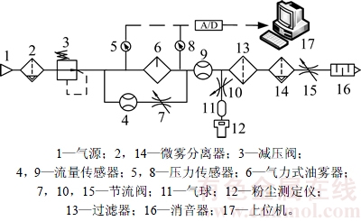 首先气源气体经过微雾分离器分离其中的油雾,消除气源压缩空气中已存在的油雾对试验的影响。减压阀调节系统及油雾器进口压力,采用压力传感器测量油雾器进、出口压力,并由上位机进行数据采集。