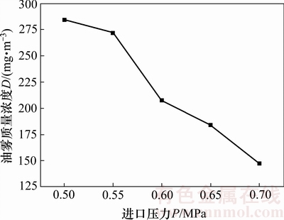 式(6)亦表明,在进出口P0,P2的压差△P一定时,若二者比值P2/P0增大,会导致小孔出流速度u2减小,进而使雾化效果降低。取进出口压差为0.4 MPa时,随着进口压力的增大,P2/P0增大,小孔出流气体流速u2降低,油液不易被雾化,油雾质量浓度降低,油雾质量浓度D与进口压力P0的关系如图7所示。由图7可见:在保持进出口压差一定时,随着进口压力的增大,油雾质量浓度减少;进口压力从0.5 MPa增大到0.7 MPa时,油雾质量浓度从284.3 mg/m3近似线性地减小为147.2 mg/m3,降低幅度为48%。