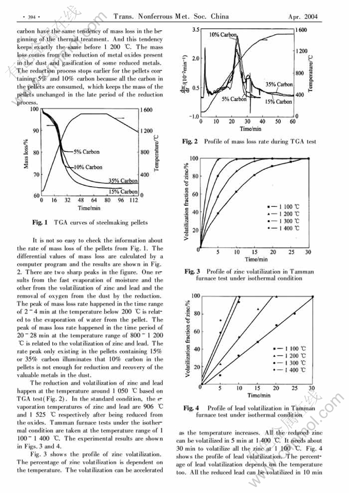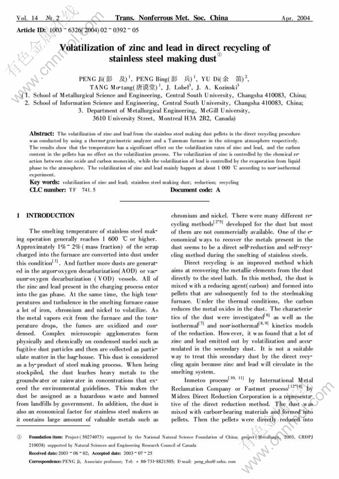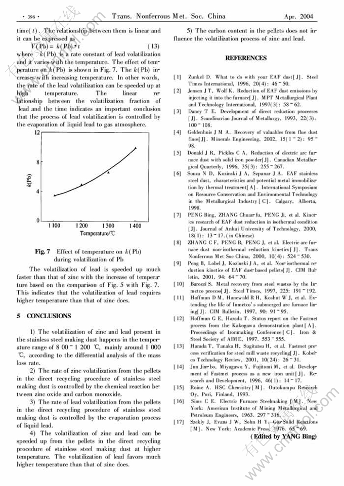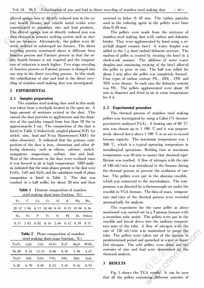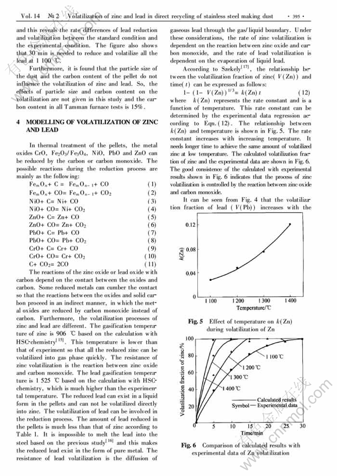 Volatilization of zinc and lead in direct recycling of stainless steel making dust①