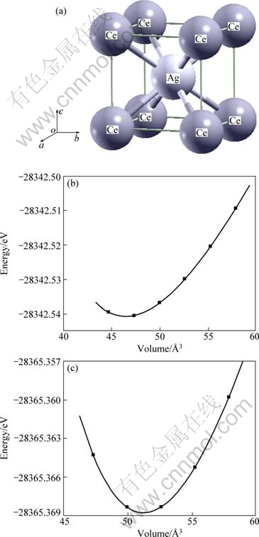 The first-principle calculations were based on the density functional theory (DFT). The total energies were calculated using full-potential linearized augmented plane-wave method (FP-LAPW) plus local orbital program as implemented in the WIEN2k package [11], and with the generalized gradient approximation (GGA) of PERDEW, BURKE and ERNZRHOF (PBE) [12] for the exchange-correlation energy. The spherical harmonics inside the muffin-tin are taken with an angular momentum lmax=10 while the charge density is Fourier expanded up to Gmax=12. The muffin-tin sphere radii (Ri) of Ce and Ag was chosen as 2.7 and 2.5 a.u., respectively. The basis function was expanded up to RminKmax=9.0 in order to achieve convergence, where Rmin is the minimum sphere radius and Kmax is the maximal value of the reciprocal lattice vector used in the plane wave expansion. Integration in the reciprocal space was performed by using the tetrahedron method with a k mesh of 12×12×12 k-points in the irreducible wedge of the Brillouin zone (BZ). The total energy is converged to within 0.01 mRy/unit cell during the self-consistency cycle.