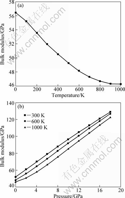 Fig. 5 Bulk modulus as function of temperature at p=0 GPa (a) and pressure dependency of bulk modulus for CeAg at 300, 600 and 1000 K (b)