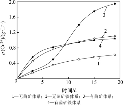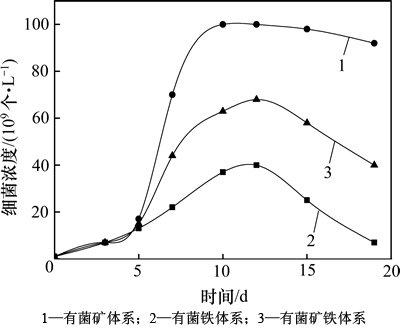 在浸出试验过程中,不同体系中细菌的浓度随时间的变化如图1所示。从图1可以看出:3种接种细菌的体系中细菌的生长均经历延滞期、指数期、稳定期和衰亡期4个阶段。在浸出前5 d,3种有菌浸出体系中细菌的浓度和变化基本相同,均是缓慢增长;随后,有菌矿体系中细菌浓度开始迅速增加,第10天达最高值1011 个·L-1,之后略微降低;在有菌矿铁体系中,细菌浓度在第12天达最高值6.8×1010 个·L-1,随后,细菌浓度开始下降;有菌铁体系中,细菌浓度在第12天达最高值4.0×1010 个·L-1,随后开始迅速下降。在有菌铁体系中由于Fe3+水解引起的低pH抑制细菌的生长,细菌浓度最低;与有菌铁体系相比,在有菌矿铁体系中由于黄铜矿可以为细菌的生长提供能源和附着载体,因而促进细菌的生长;有菌矿体系中没有加入铁离子而未使pH下降,细菌浓度最高。