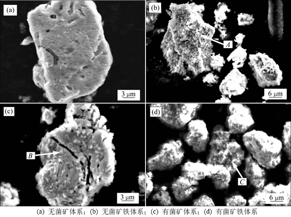 不同体系中黄铜矿浸渣的XRD检测结果如图3所示。从图3中可以看出:无菌矿体系中的浸渣含有黄铜矿、黄铁矿和硫单质;无菌矿铁体系中的浸渣含有黄铜矿、硫单质和黄钾铁矾;有菌矿体系中的浸渣含有黄铜矿和黄钾铁矾;有菌矿铁体系中的浸渣含有黄铜矿、铵黄钾铁矾和黄钾铁矾。可见,向黄铜矿的浸出体系中加入总铁离子质量浓度为12 g/L的溶液(ρ(Fe2+):ρ(Fe3+)=1:1)后,无论是否接种细菌,均有大量铁矾产生。