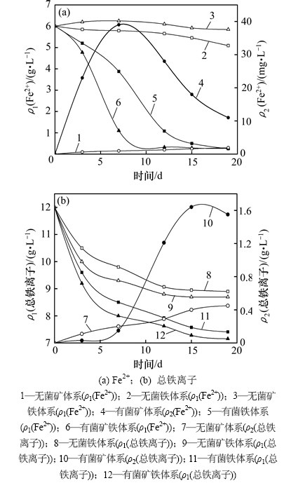 微生物湿法冶金作为一种绿色清洁的冶金技术在冶金工业中得到广泛应用[1]。黄铜矿作为自然界最主要的铜矿物(占世界铜储量的70%以上),是铜矿物中最难浸出的一种[2],因而黄铜矿的浸出是当今硫化铜矿生物冶金研究中的难点。国内外许多学者对黄铜矿浸出过程中的动力学和钝化现象进行研究[3],有学者[4]认为浸出过程中在黄铜矿表面生成的低可溶性的含铜多硫化物是黄铜矿钝化的原因,而多数学者认为黄钾铁矾等沉淀的形成是黄铜矿浸出速率低的重要原因[5-6]。研究者发现,Fe2+对黄铜矿的浸出具有促进作用[7],Fe3+对黄铜矿的浸出也有影响[8-9],同时黄铜矿的浸出动力学与氧化还原电位有联系,在较低的电位下,可得较高的铜浸出率[10],而黄钾铁矾更倾向于在较高电位下形成[6]。浸出溶液的氧化还原电位主要由Fe3+与Fe2+的质量浓度比决定,因此,铁离子必然对黄铜矿的浸出具有显著影响。本文作者通过比较几种不同的黄铜矿浸出体系,探究铁的加入对黄铜矿生物浸出的影响以及黄铜矿的存在对Fe2+氧化速率和Fe3+水解的影响。