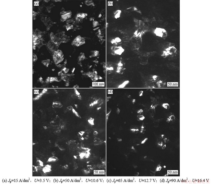 保持占空比10%、频率2 kHz不变,通过改变脉冲峰值电流密度,获得了晶粒尺寸从200 nm到50 nm的复合电铸层。图4所示是晶粒平均尺寸分别为200,90,70和50 nm的复合电铸层的透射电镜(TEM)暗场图。由图4可见:镍晶粒尺寸随着脉冲峰值电流的增大而减小。